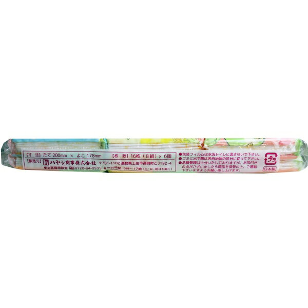 ハヤシ商事株式会社個装サイズ:90X170X27mm個装重量:約50g内容量:6パック入製造国:日本【発売元:ハヤシ商事】【寸法】たて200mm×よこ178mm【枚数】16枚(8組)X6コ入【ご注意】・包装フィルムは水洗トイレに流さないでください。